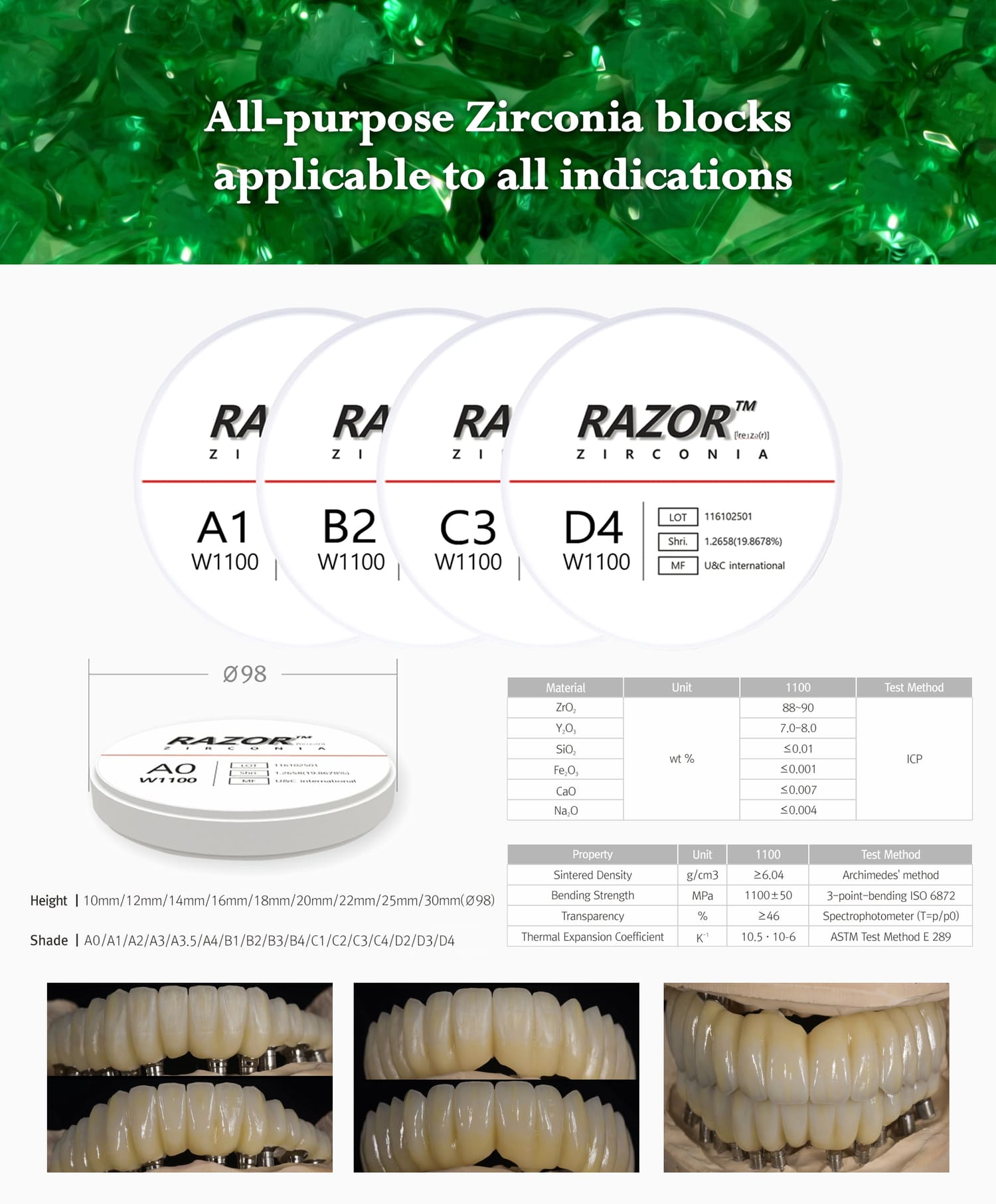 It is a surprisingly well matched zirconia block with the VITA Shade Guide. You can make the best prosthetics by using RAZOR 1100 of 16 different VITA shades and bleached (A0). (17 shades in total)